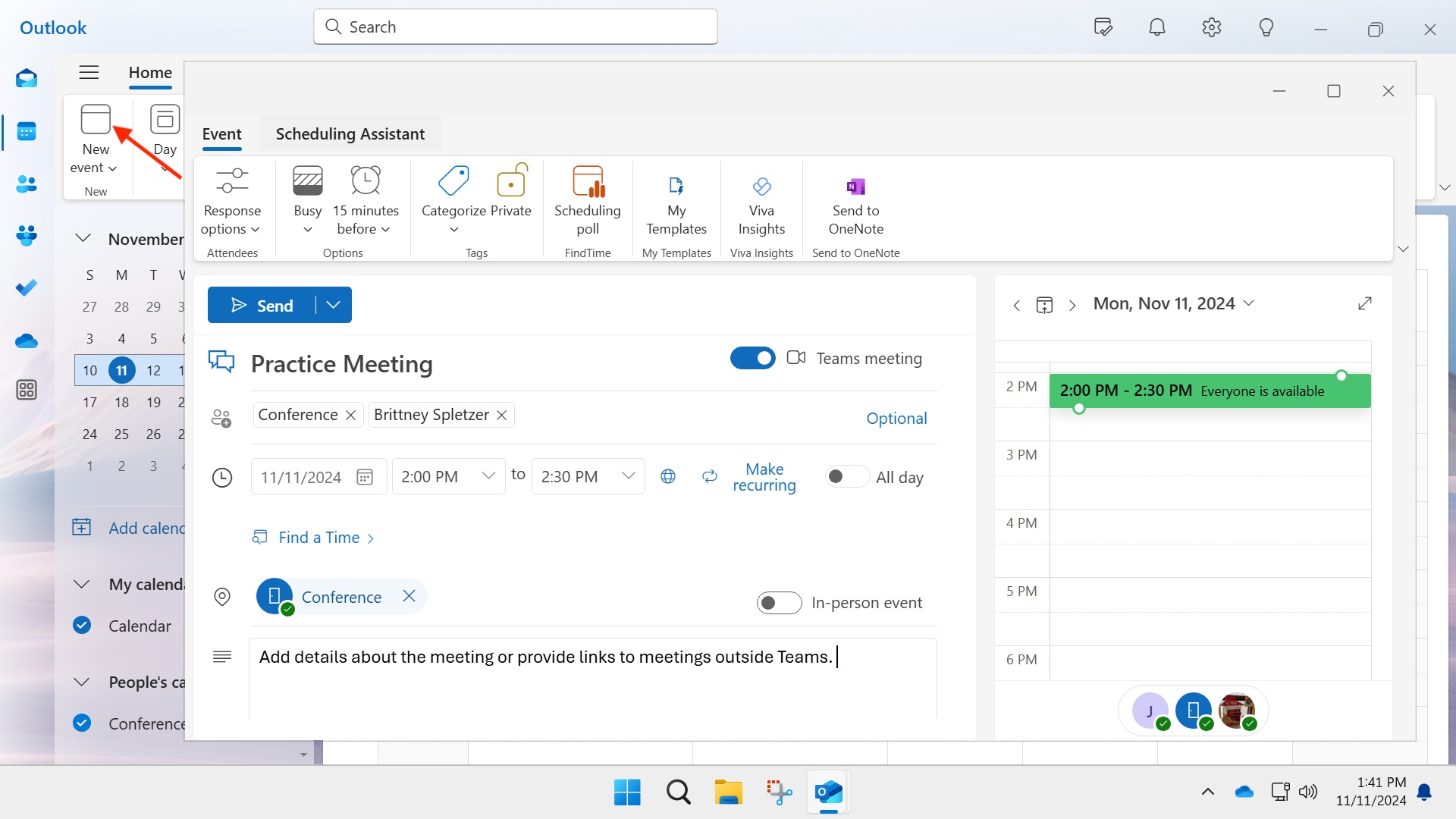 - From your outlook calendar create a new event.