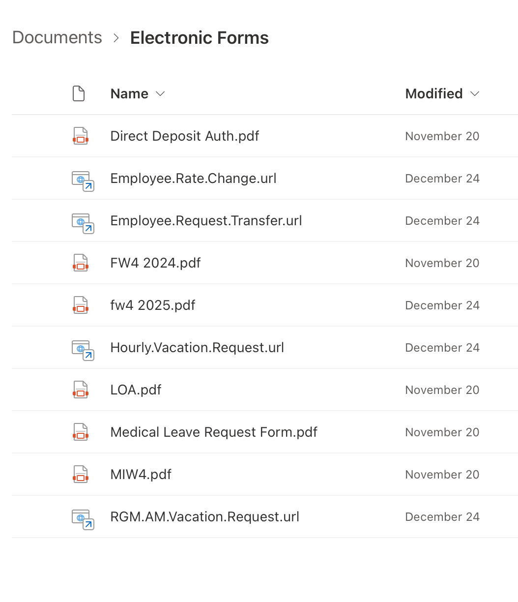 The following forms are the biggest change effective January 2025. Hourly Employee Vacation Request, RGM Vacation Request, Employee Rate Change Form, and Employee Transfer Request Form. These forms no longer open in office and require you to save and download before sending them to Payroll. The new forms start with a link and automatically move to the ASL for approval and then to Payroll for final processing.